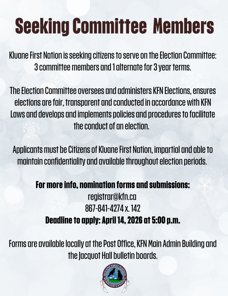 Please contact Reception by Friday, December 5th: reception@kfn.ca | 867.841.4274